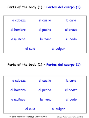 El cuerpo / Body parts - Pinterest May 1, 2019 - Explore Spanish Mama's board "El cuerpo / Body parts", followed by 37,292 people on Pinterest. See more ideas about learning spanish, teaching spanish, spanish lessons. Body parts in Spanish: List of 50 parts of the human body - Blablalang LIST OF BODY PARTS IN SPANISH AND ENGLISH Let's take a look at a list of body parts with their translation to English: el cuerpo humano (human body) la cabeza (head) el pecho (chest) el oído / la oreja (ear) el ojo (eye) la cara (face) la mano (hand) la boca (mouth) el pie (foot) la espalda (back) el pelo (hair) el codo (elbow) el dedo (finger) Body Parts in Spanish: Vocabulary, Grammar and More! Body Parts in Spanish That Make Up Your Legs and Feet - "La pierna" Leg - la pierna Knee - la rodilla Ankle - el tobillo Foot - el pie Toe - el dedo de pie Thigh - el muslo Calf - la pantorrilla Heel - el talón Body Parts in Spanish Inside the Body Brain - el cerebro Throat - la garganta Stomach - el estómago Heart - el corazón Lungs - los pulmones