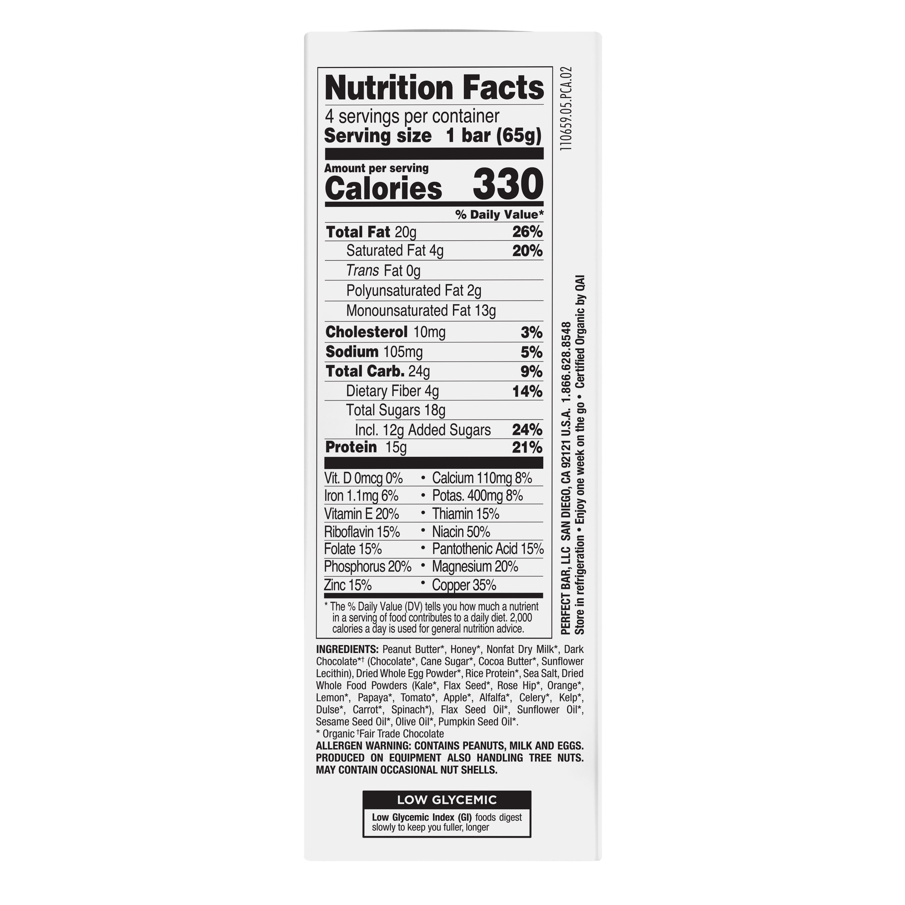 Perfect Bar Dark Chocolate Chip Peanut Butter Protein Bar Sodium 105mg, 5% ; Potassium 0, 8% ; Total Carbohydrate 24g, 9% ; Dietary Fiber 4g, 14% ...