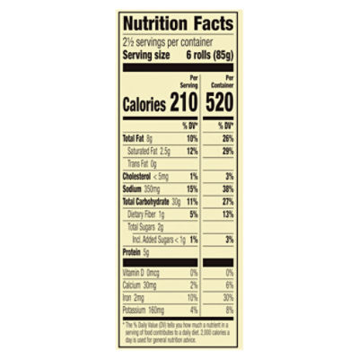 Totino's Cheese Pizza Rolls, 19.8 oz Nutrition Facts & Calories - Inlivo Contains a moderate amount of risky components that may include saturated fat, cholesterol, sodium and sugars (0.02%/oz). Good source of proteins (18% of DV/100g). Calories in 1 Miniature Roll (0.5 oz) 48 calories / 14 from fat Carbohydrates 7.5 g Proteins 1.3 g Fat 1.5 g Saturated Fat 0.4 g Calories Nutrition Risky Content High Density (3.5 cal/g)