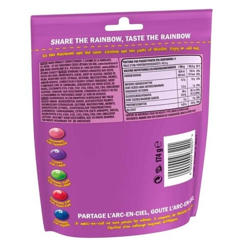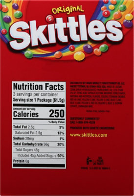 SKITTLES Original Fruity Candy Single Pack, 2.17 oz Every pack of SKITTLES Original Fruity Candy gives you the chance to Taste the Rainbow, with a variety of fruit flavors almost too good to be true. Flavors include strawberry, green apple, grape, lemon and orange. Where To Buy Serving Size 1 package (61.5g) Servings Per Container 1 Amount per serving % Daily value Calories 250 Total Fat 2.5 g 3%