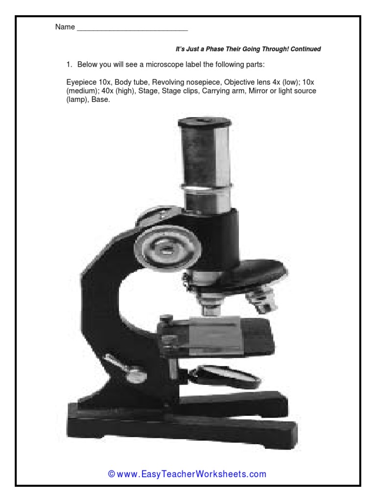 scienceexplorers.com › guide-to-teaching-kidsGuide to Teaching Kids About Cells | Science Explorers Apr 25, 2019 · Give each student a chance to look through the microscope at the cells. Point out that each slide contains numerous cells. Repeat the process with the second slide. Have students draw pictures of what they saw under the microscope and guess what the cells do. Finish with an explanation of the cell and its organelle functions. Microscope Parts, Function, & Labeled Diagram - slidingmotion Microscope Parts Labeled Diagram The principle of the Microscope gives you an exact reason to use it. It works on the 3 principles. Magnification Resolving Power Numerical Aperture. Parts of Microscope Head Base Arm Eyepiece Lens Eyepiece Tube Objective Lenses Nose Piece Adjustment Knobs Stage Aperture Microscopic Illuminator Condenser Lens Parts of the Microscope with Labeling (also Free Printouts) Parts of the Microscope with Labeling (also Free Printouts) By Editorial Team March 7, 2022 A microscope is one of the invaluable tools in the laboratory setting. It is used to observe things that cannot be seen by the naked eye. Table of Contents 1. Eyepiece 2. Body tube/Head 3. Turret/Nose piece 4. Objective lenses 5. Knobs (fine and coarse) 6.
